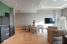 The apartment features a well-laid-out living space with stylish furniture, a sleek open kitchen with fitted appliances, and a cozy bedroom complete with built-in wardrobes. Natural light fills the unit, creating a bright and welcoming atmosphere.