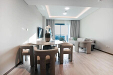 The apartment features a well-laid-out living space with stylish furniture, a sleek open kitchen with fitted appliances, and a cozy bedroom complete with built-in wardrobes. Natural light fills the unit, creating a bright and welcoming atmosphere.
